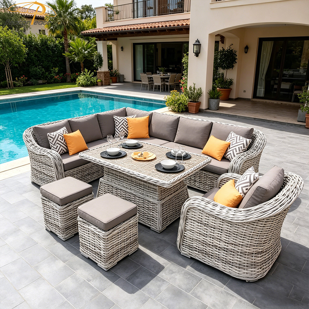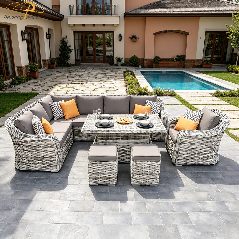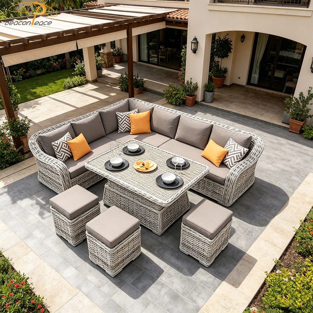 This handcrafted outdoor garden sofa set features high-resilience synthetic rattan, meticulously woven by hand, and is paired with comfortable, quick-drying, and waterproof cushions. Resistant to UV rays and aging, it stands impervious to the elements—come sun or rain. Its spacious, L-shaped modular design comfortably accommodates multiple people for relaxation and dining, while its versatile aesthetic complements a wide variety of outdoor settings. It creates a deeply soothing outdoor sanctuary, ensuring that every moment of your leisurely "slow time" is filled with pure comfort and tranquility.