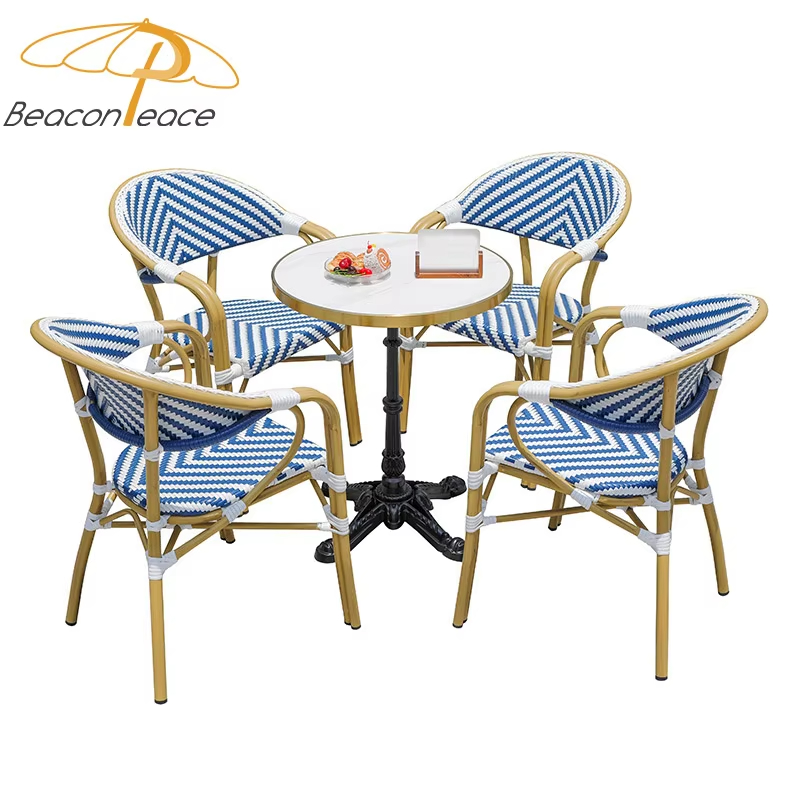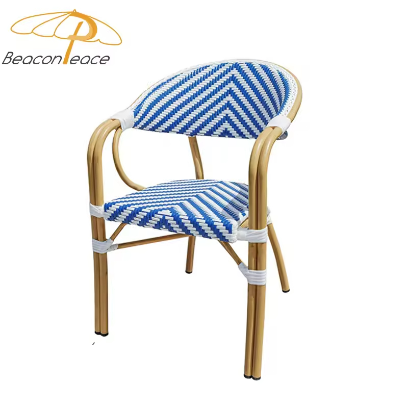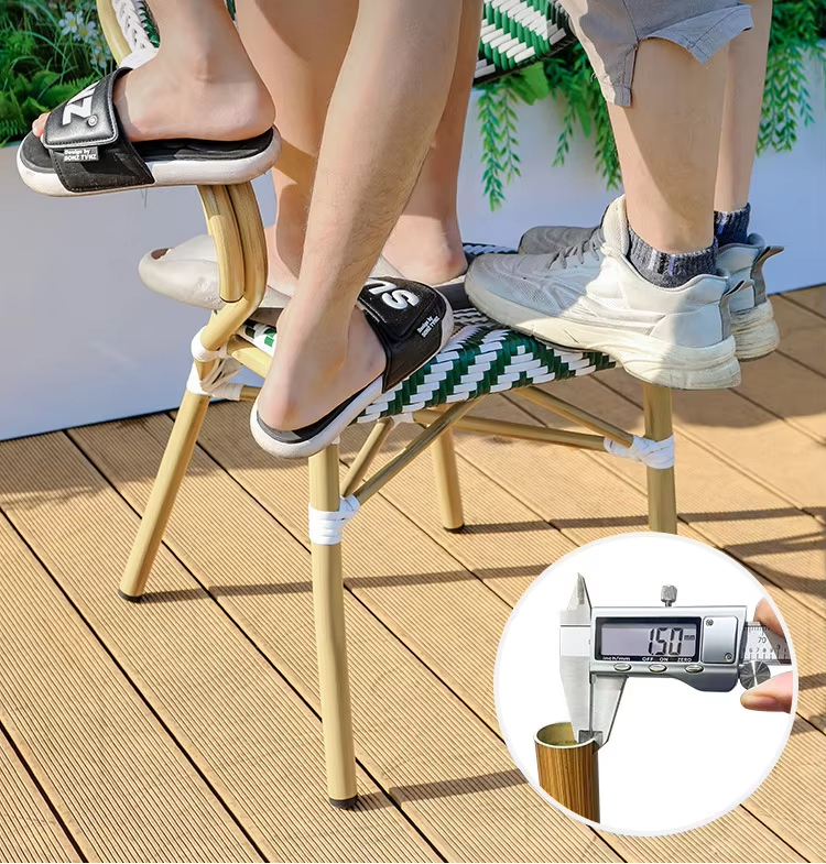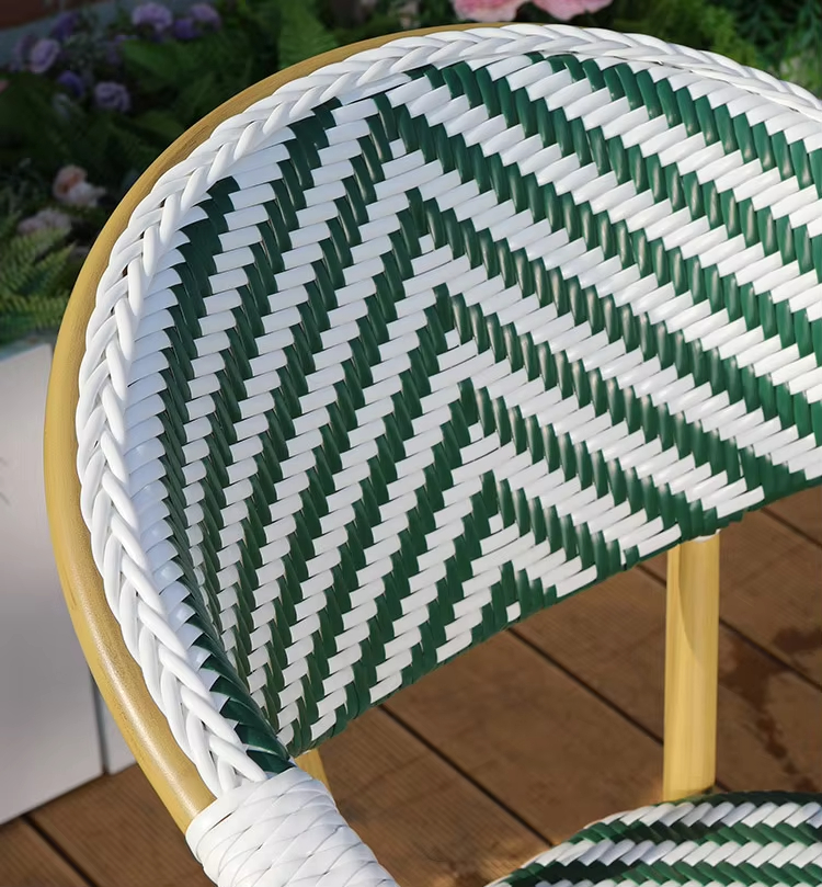 This French woven rattan chair is characterized by elegant French design and exquisite craftsmanship, perfectly blends into the atmosphere of every outdoor tea restaurant or coffee shop. The back and seats use classic rattan craftsmanship, which feels delicate, comfortable and breathable, making every meal or leisure time full of style and relaxation. The bottom is made of an aluminum alloy frame with imitation wood grain spray, which not only retains the natural beauty of the wood, but also has the weather resistance and lightness of the aluminum alloy, resisting the challenges of the outdoor environment. Whether it’s a warm sunshine or a breeze afternoon, it adds a touch of French romance and elegance to your outdoor space, making it ideal for you.