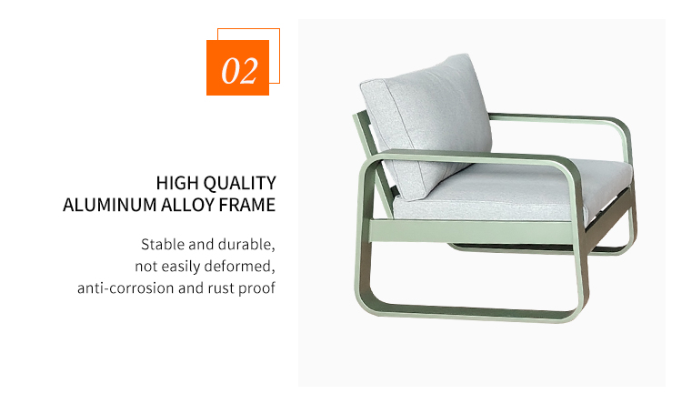The BP7991 outdoor sofa features a high-quality aluminum alloy frame treated with a refined brushed finish. This process endows it with both a premium metallic aesthetic and exceptional resistance to rust and corrosion, ensuring a structure that is simultaneously sturdy and lightweight—capable of withstanding the rigors of outdoor exposure to sun and rain. Paired with highly resilient, waterproof seat and back cushions, the sofa offers a plush, comfortable seating experience that is both water-resistant and easy to clean, requiring no tedious maintenance. Its minimalist linear design complements a variety of outdoor settings—such as courtyards and patios—striking a perfect balance between visual appeal and practical functionality.