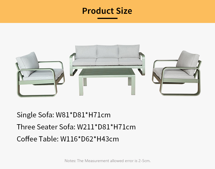 Sofas: Powder Coated Aluminum Frame eat Cushions:T10cm Coffee Table: Full Aluminum |