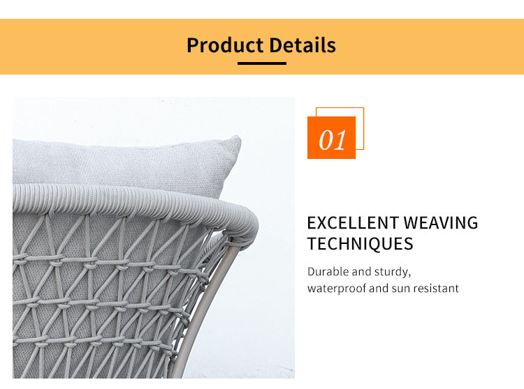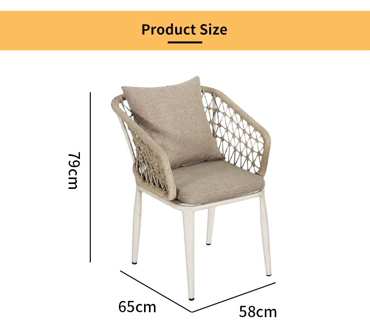 Table:aluminum frame with powder coated finish Chair:aluminum frame+outdoor rope weaving+waterproof cushion |