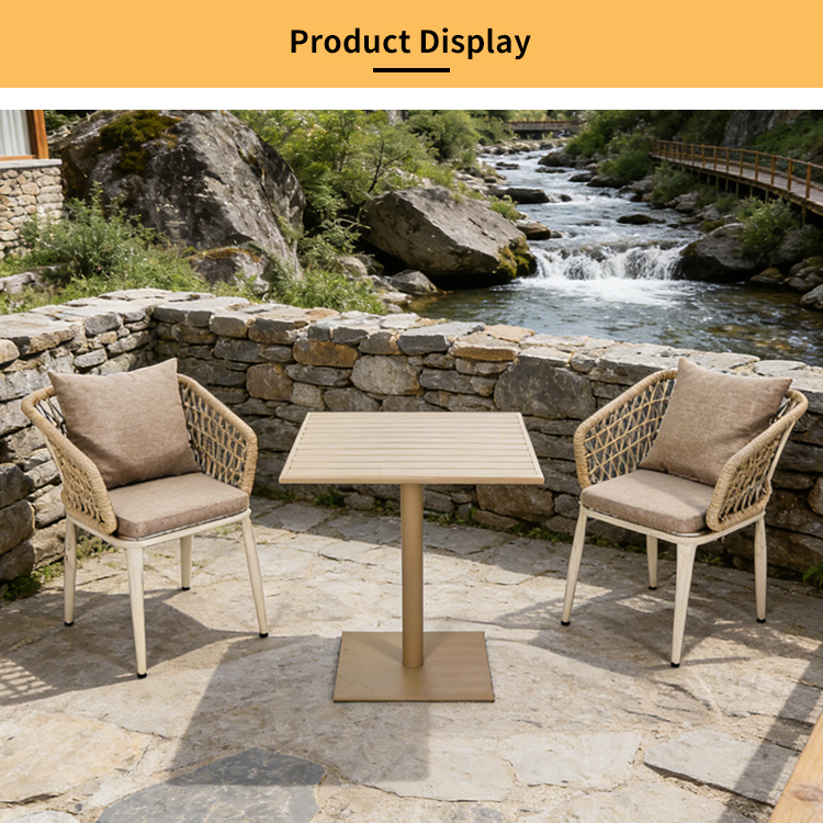 This BP1629&2041 outdoor three-piece set, consisting of one table and two chairs, features a lightweight yet sturdy aluminum alloy frame with excellent corrosion and rust resistance, ensuring long-lasting durability. The woven rattan backrest design is breathable, preventing stuffiness, and combined with soft cushions, provides exceptional comfort even during prolonged sitting. Its compact design is perfect for balconies or patios, adding a touch of comfort and practicality to your outdoor space, whether you're enjoying a light breakfast in the morning or a drink in the evening.