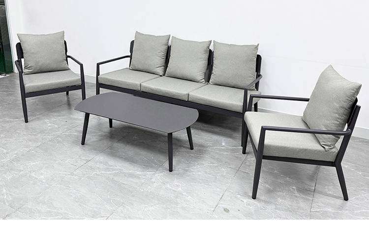 This aluminum alloy sofa is made with a high-quality aluminum alloy frame, making it lightweight and easy to move, facilitating flexible space arrangement. It also boasts excellent corrosion resistance, making it suitable for various outdoor environments. Furthermore, it features soft and thick cushions that provide excellent back support and a comfortable seating experience, ideal for extended use. The cushions are made of waterproof material, ensuring they remain dry even in rainy weather. The combination of two single sofas and one three-seater sofa offers flexibility to adapt to different occasions and needs.