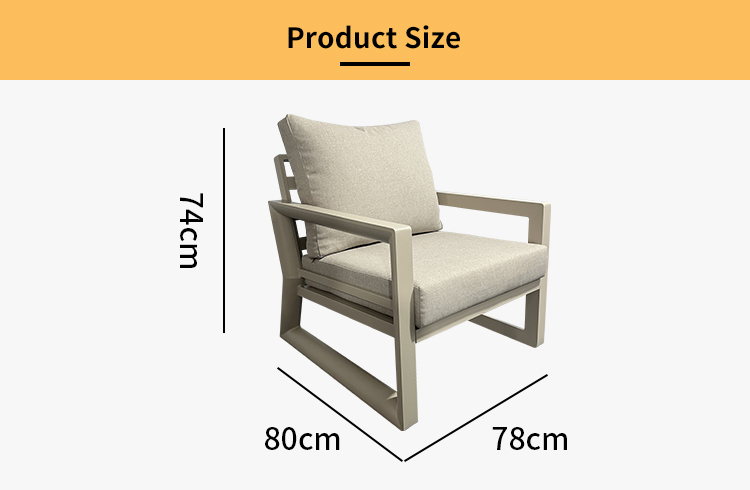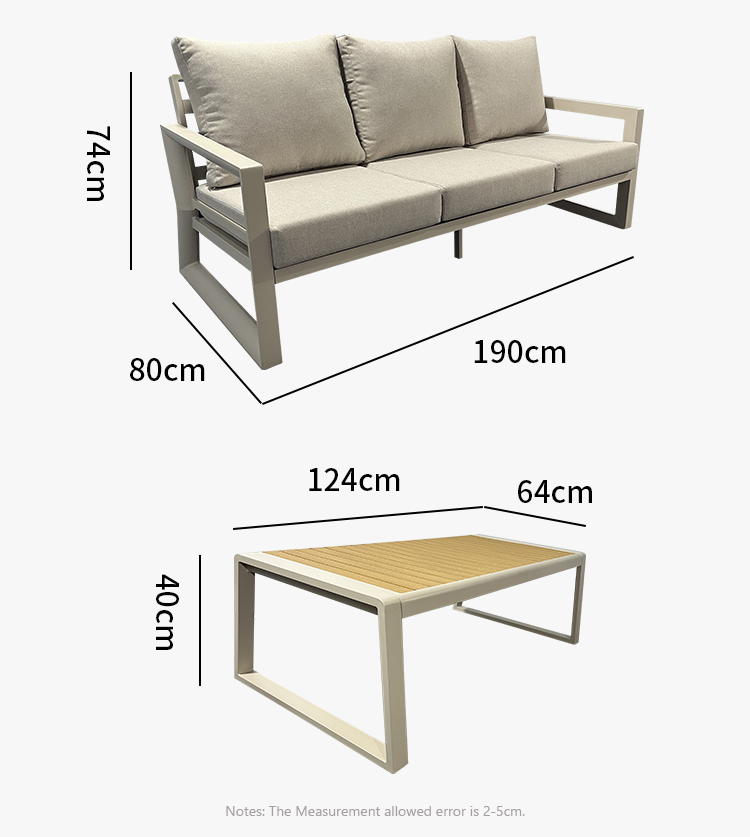 Sofa: Powder Coated Aluminum Frame+Water Resistant Outdoor Fabric Seat&Back Cushions Coffee Table: Powder Coated Aluminum Frame+Plastic Wood Top+Stainless Steel Ice Bucket(50cm*40cm) |