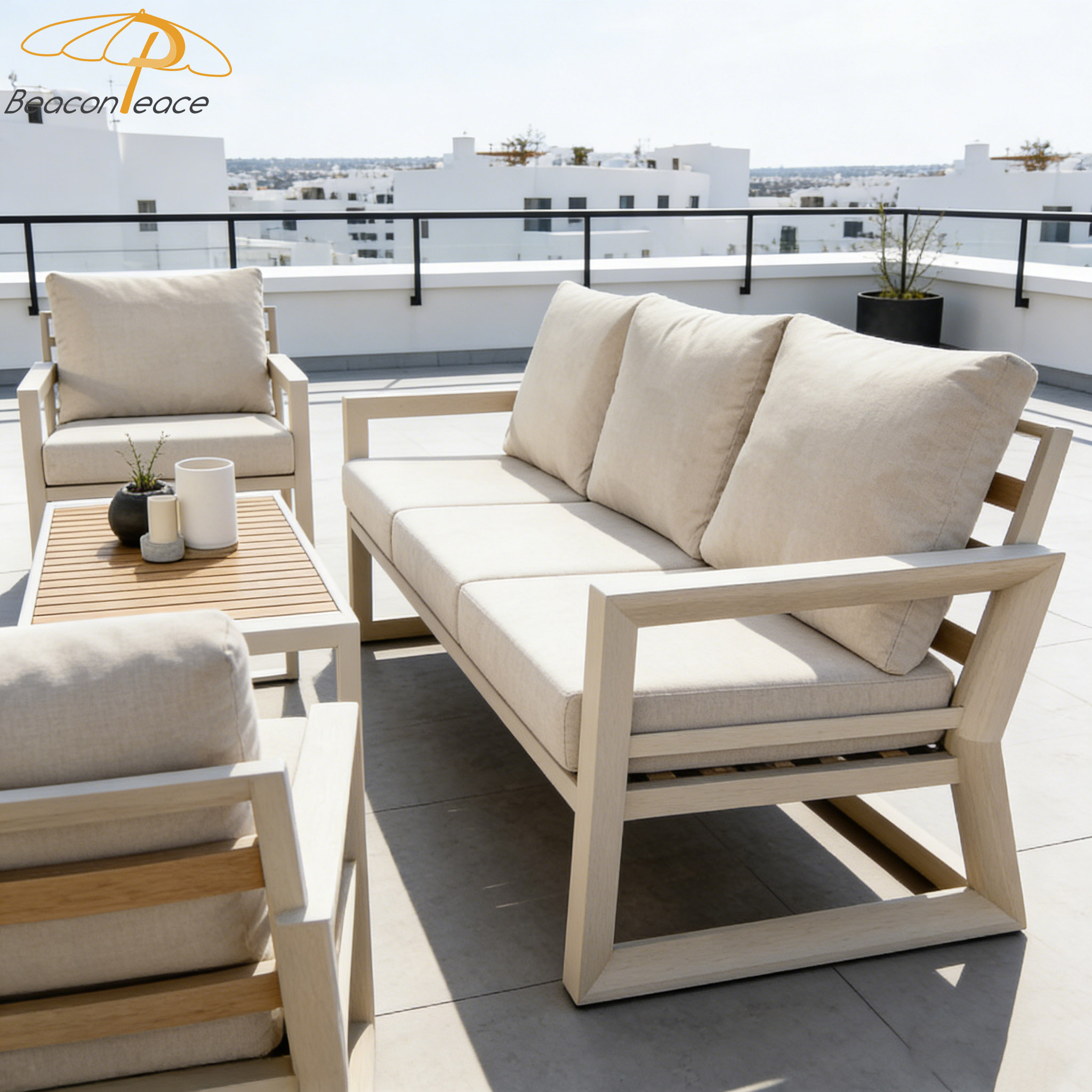 Sofa: Powder Coated Aluminum Frame+Water Resistant Outdoor Fabric Seat&Back Cushions Coffee Table: Powder Coated Aluminum Frame+Plastic Wood Top+Stainless Steel Ice Bucket(50cm*40cm) |