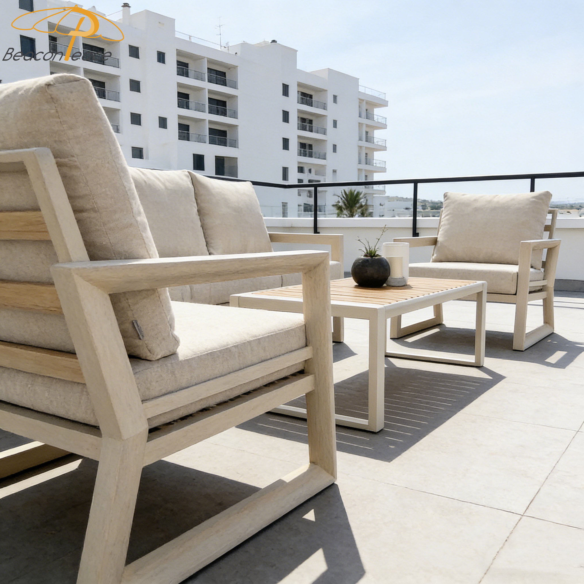 Sofa: Powder Coated Aluminum Frame+Water Resistant Outdoor Fabric Seat&Back Cushions Coffee Table: Powder Coated Aluminum Frame+Plastic Wood Top+Stainless Steel Ice Bucket(50cm*40cm)Vorlaufzeit :